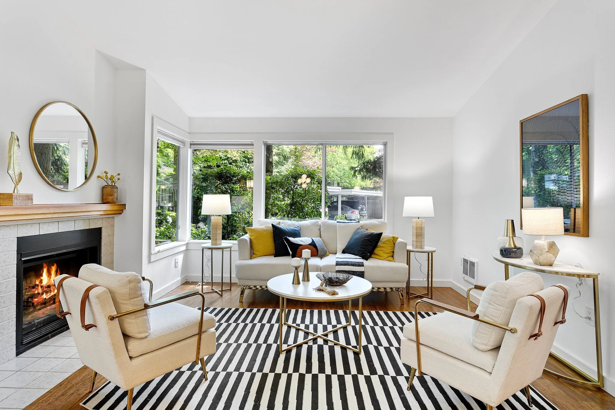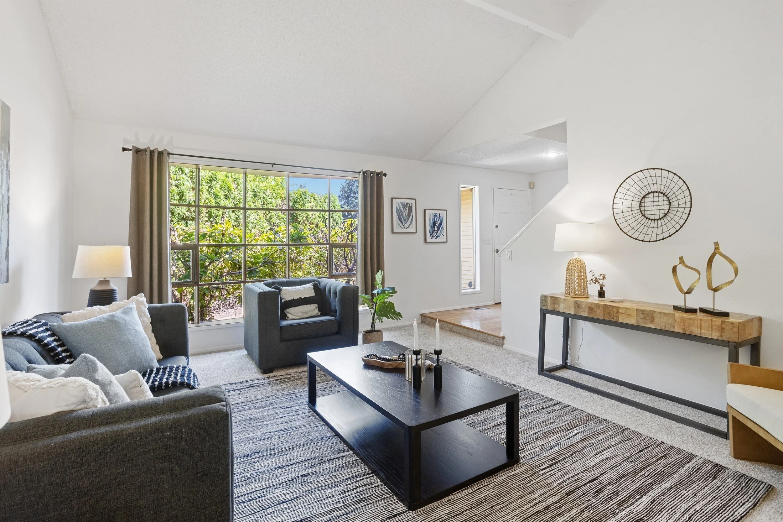 Set back from the street in a tranquil neighborhood, this 4-bedroom home features a generous, updated kitchen with stainless appliances, living room with vaulted ceilings, and lots of open sq footage. Excellent solar orientation, and natural light throughout the day. The tiered, mature backyard is fully fenced and perfect for gatherings and gardening. Fresh interior paint and carpet. Recently installed energy-efficient gas fire insert w/ blower in the family room. Two-car garage. Excellent Lake Washington School District.